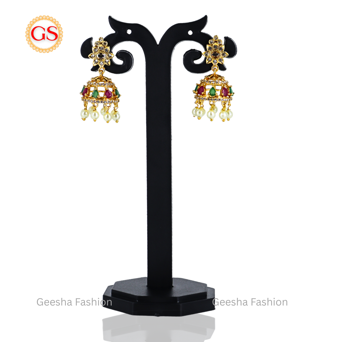 Elevate your jewelry collection with this exquisite antique design American diamond necklace set, featuring a stunning blend of red, green, and white stones for a vibrant, regal look. This intricately crafted set comes with matching earrings and an added back chain for adjustable comfort and a perfect fit.