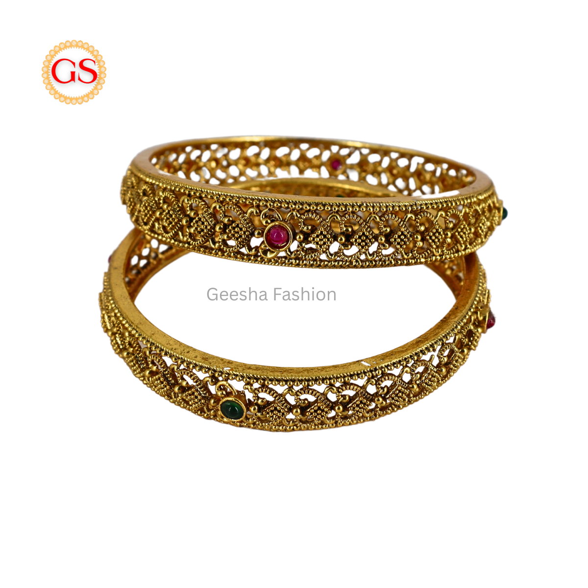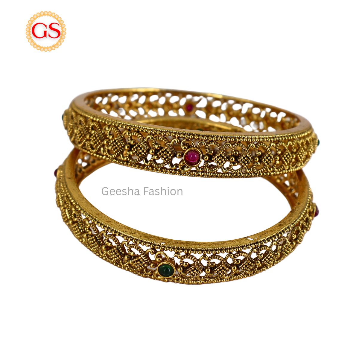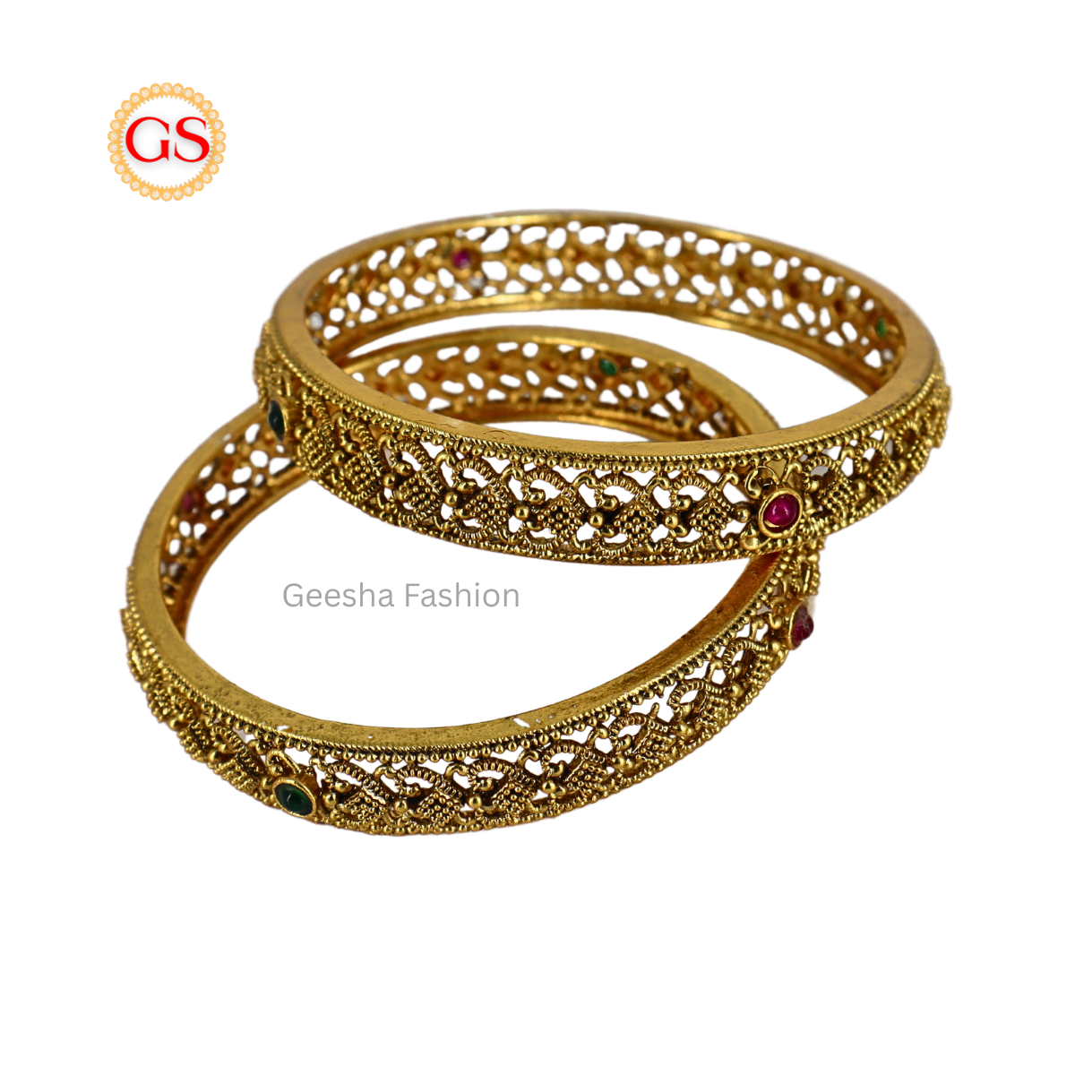 Elevate your ethnic style with these stunning Red and Green Stone Heart Design Antique Bangles, beautifully crafted to blend timeless tradition with graceful charm. Featuring intricately detailed heart motifs adorned with vibrant red and green stones, these bangles exude antique elegance and cultural richness. Perfect for festivals, weddings, or traditional occasions, they complement sarees, lehengas, and other ethnic outfits effortlessly. Crafted with a premium antique finish, these bangles for women offer a vintage-inspired look with modern comfort.